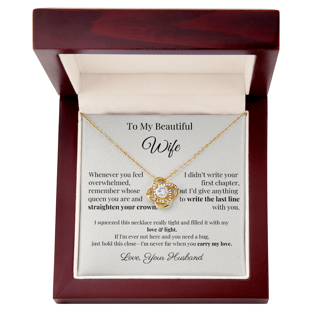 This beautifully crafted Love Knot Necklace comes with a heartfelt message card designed to touch your wife's soul. Whether it’s your anniversary, her birthday, or just because—this gift is a timeless way to say, "You are everything to me."